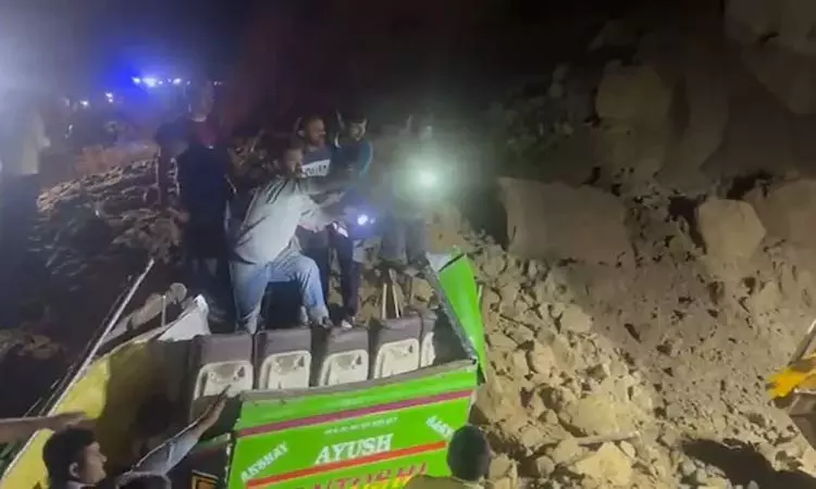 இமாச்சலபிரதேச மாநிலம் பிலஸ்பூர் மாவட்டம் மொரோடன் நகரில் இருந்து குளு மாவட்டம் கலல் நகருக்கு இன்று மாலை ஆம்னி பஸ் சென்றுகொண்டிருந்தது. அந்த பஸ்சில் 15க்கும் மேற்பட்டோர் பயணித்தனர். இந்நிலையில், பிலஸ்பூரின் பாலு நகர் உள்ள பாலம் அருகே மலைப்பாங்கான பகுதியில் பஸ் சென்றுகொண்டிருந்தது. அப்போது, எதிர்பாராத விதமாக மலைப்பகுதியில் நிலச்சரிவு ஏற்பட்டது. இந்த நிலச்சரிவில் ஆம்னி பஸ் சிக்கிக்கொண்டது. பஸ் முழுவதும் பாறைகள் விழுந்து, பஸ் முழுவதும் மண் மூடியது.