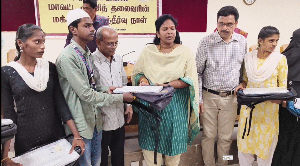 க பணியாற்றி பணியில் இருக்கும் போதே உயிரிழந்த குடும்பத்தினருக்கு கருணை அடிப்படையில் பணி நியமன ஆணையை மாவட்ட ஆட்சியர் சிவசௌந்தரவல்லி வழங்கினார். அதே போன்று பெற்றோர்களை இழந்து கல்லூரிகளில் படிக்கும் மாணவர்களுக்கு நான் முதல்வன் திட்டத்தின் கீழ் 30 ஆயிரம் மதிப்பிலான லேப்டாப்களை மாணவர்களுக்கு மாவட்ட ஆட்சியர் வழங்கினார். அப்போது நல்லா படிங்க ஆழ்தபெஸ்ட் என்று கூறி வழியனுப்பினார்.