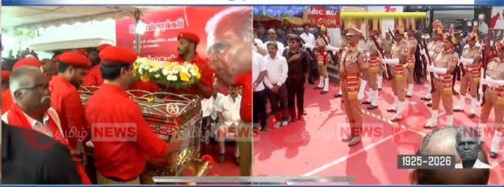 இந்நிகழ்வில் வைகோ, டி.ராஜா. கி.வீரமணி உள்ளிட்டோர் இறுதி மரியாதையில் பங்கேற்றுள்ளனர். செல்வபெருந்தகை, திருமாவளவன் உள்ளிட்டோரும் அஞ்சலி.