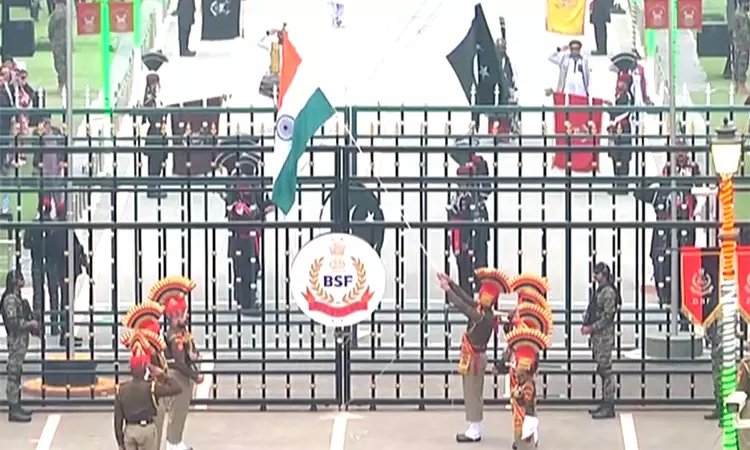 இந்தியாவின் 77-வது குடியரசு தின விழா இன்று நாடு முழுவதும் மிகுந்த எழுச்சியுடன் கொண்டாடப்பட்டு வருகிறது. இதன் ஒரு பகுதியாக, இந்திய-பாகிஸ்தான் எல்லையான பஞ்சாப் மாநிலம் அட்டாரி-வாகா பகுதியில் குடியரசு தின சிறப்பு கொடியிறக்க நிகழ்ச்சி மிகவும் விமரிசையாக நடைபெற்றது.