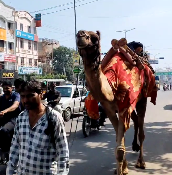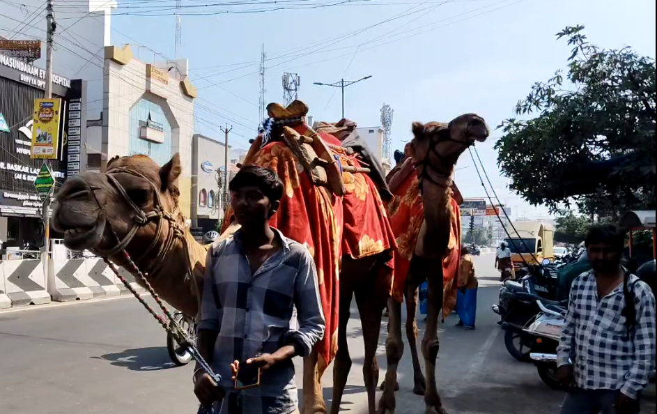 பாலைவனக் கப்பல் என்று அழைக்கப்படும் ஒட்டகம், கரூரின் பரபரப்பான சாலைகளில் மெதுவாக நடந்து சென்ற காட்சி சிறிது நேரம் அந்தப் பகுதியில் பெரும் உற்சாகத்தை ஏற்படுத்தியது.