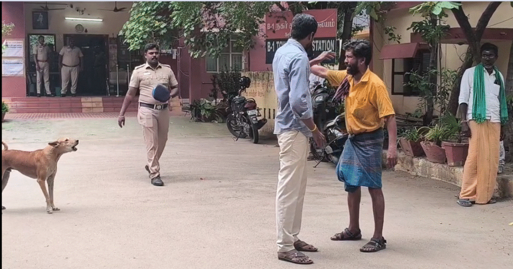 அப்போது காவல் நிலையத்தையே சுற்றி சுற்றி வந்த நாய் ஒன்று மது போதையில் இருந்த நபரை