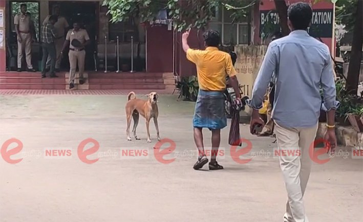 அப்போது அங்கு வந்த காவலர் ஒருவர் அவரை வெளியே அழைத்துச் சென்றார். அப்போதும் விடாத நாய் அவரை பின்தொடர்ந்து குரைத்துக் கொண்டே வெளியே அனுப்பியது. அத