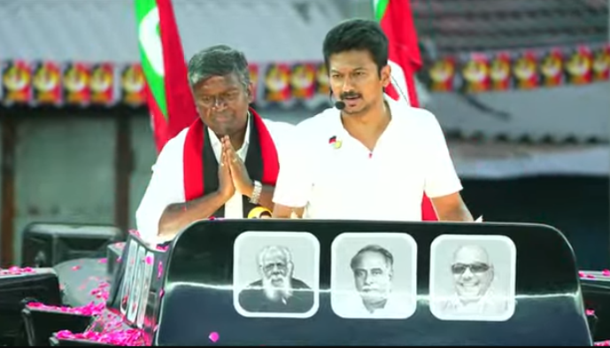 கரூர் பழைய பேருந்து நிலைய ரவுண்டானா அருகில் திமுக இளைஞரணி செயலாளர், தமிழக துணை முதல்வர் உதயநிதி ஸ்டாலின் திமுக வேட்பாளர்களை ஆதரித்து தேர்தல் பரப்புரை மேற்கொண்டார். கரூர் தொகுதி வேட்பாளர் தியாகராஜன் மற்றும் அரவக்குறிச்சி தொகுதி வேட்பாளர் மொஞ்சனூர் இளங்கோ ஆகியோரை அறிமுகம் செய்துவைத்து தொண்டர்கள் மத்தியில் உதயநிதி பிரச்சாரம் செய்தார்.கரூர் மாவட்டத்தின் எழுச்சியை பார்க்கும்போது மீண்டும் ஆட்சி அமைக்கப் போவது நாம் தான் என்பது தெரிகிறது. கலைஞரையும் கரூரையும் பிரித்துப் பார்க்க முடியாது. ஏனென்றால் கரூர் மாவட்டம், குளித்தலையில் தான் முதன் முதலில் கலைஞர் போட்டியிட்டு வெற்றி பெற்றார். கடந்த ஐந்து ஆண்டுகளில் கரூர் மாவட்டத்திற்கு 5000 கோடி அளவிற்கு திட்டங்களை வழங்கி இருக்கிறோம்.வெண்ணைமலை கோவில் இனாம் நில பிரச்சனைகளுக்கு தீர்வு காண சிறப்பு அதிகாரிகள் நியமனம் செய்யப்பட்டுள்ளனர். அதிமுகவின் பொய் பிரச்சாரங்களை நம்பாதீர்கள்.