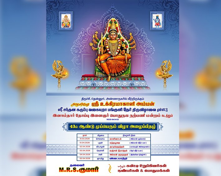 இவர்கள் ஏற்பாடில் தென்னூர் கிராம தேவதை அருள்மிகு ஸ்ரீ உக்கிரமாகாளியம்மன் வருடாந்திர பங்குனி தேர்த்திருவிழாவை முன்னிட்டு 02/04/2026 (வியாழன்) குட்டிகுடித்திருவிழா அன்று தென்னூர் இனாம்தார் தோப்பு இளைஞர் பொதுநல நற்பணி மன்றம் சர்பாக 43-ம் ஆண்டு மாபெரும் அன்னதானம் மகாத்மா பள்ளி பாலம் அருகில் மிக விமர்சையாக நடைபெற உள்ளது.
