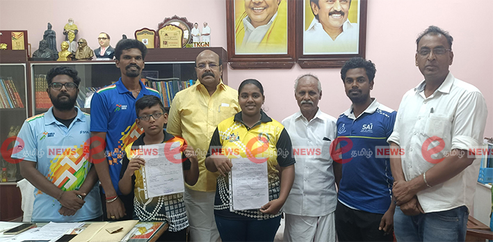மேலும் தேசிய அளவிலான 69 வது வில்வித்தை போட்டியில் தமிழ்நாடு அணி சார்பாக பங்கேற்க தேர்வாகி உள்ளனர். இதையடுத்து தஞ்சாவூர் எம்எல்ஏ டி கே ஜி நீலமேகத்தை அவரது அலுவலகத்தில் சந்தித்து வாழ்த்து பெற்றனர். அப்போது கர்ணன், பயிற்சியாளர்கள் வீரமுத்து, விஜய், காவியன் ஆகியோர் உடன் இருந்தனர்.