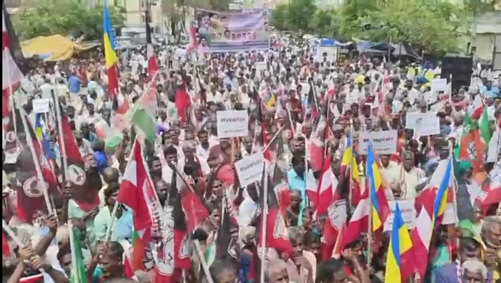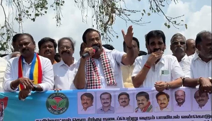 அந்த பஸ் ஸ்டாண்ட் அரைகுறை வேலையோடு திறக்கப்படுகிறது என்று சொன்னால், உங்கள் ஆட்சியினுடைய அவல நிலை எப்படி இருக்கிறது? நீங்கள் செய்த சாதனை அரியலூர் மாவட்டத்திலே ஒரு பேருந்து நிலையத்தை கட்டிவிட்டு, அந்த பேருந்து நிலையத்தை ஐந்தாண்டு காலமாக கட்டிய சாதனை என்று சொன்னால், அது இங்கு இருக்கின்ற அமைச்சர், இங்கு இருக்கின்ற சட்டமன்ற உறுப்பினருடைய ஒரு கேவலத்தை எடுத்துக்காட்டும் விதமாக இருக்கிறது என்று அமைச்சர் சிவசங்கரை கடுமையாக தாக்கி அதிமுக முன்னாள் அரசு கொறடா தாமரை ராஜேந்திரன் பேசியது பரபரப்பை ஏற்படுத்தியுள்ளது. கண்டன ஆர்ப்பாட்டத்தில் ஆயிரக்கணக்கான தேசிய ஜனநாய கட்சியின் பொறுப்பாளர்கள் மற்றும் தொண்டர்கள் கலந்து கொண்டு திமுக அரசுக்கு எதிராக கோசமிட்டனர்.