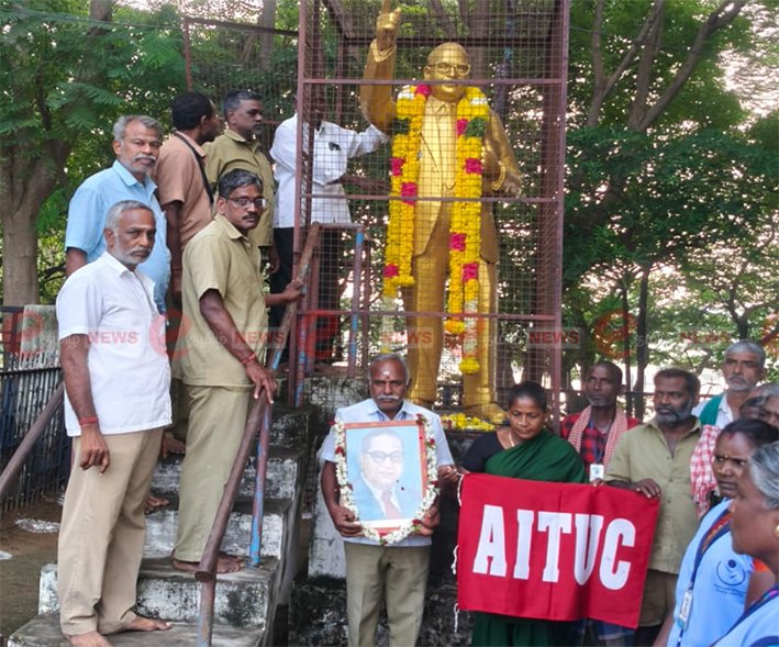 இந்திய அரசியல் சட்டத்தை உருவாக்கிய மாமேதை டாக்டர் அம்பேத்கர் அவர்களின் 69 வது நினைவு தினமான இன்று, மாவட்ட தலைநகர் அரியலூரில் பேருந்து நிலையம் எதிரே உள்ள அம்பேத்கர் திருவுருவ சிலைக்கு ஏ ஐ டி யு சி சுகாதார தொழிலாளர்கள் சார்பாக அரியலூர் நகராட்சி அலுவலகத்திலிருந்து சங்கத் தலைவரும் உள்ளாட்சித் துறை சம்மேளன மாநில செயலாளர் தோழர் டி தண்டபாணி தலைமையில் நகராட்சி ஏ ஐ டி யு சி செயலாளர் ரெ. நல்லுசாமி, செ மாரியப்பன் முன்னிலையில் ஊர்வலமாக வந்து மாலை அணிவித்து மரியாதை செலுத்தினர். நிகழ்ச்சியில் நகராட்சி தொழிலாளர்கள் கு. சிவஞானம், க. பெருமாள், ரெ. வெங்கடேசன், ரா முத்தையன், க. கலையரசி, அ. செல்வி, தே. சின்னப்பொன்னு, தமிழரசி, பா. காத்தவராயன் மற்றும் ஜெயங்கொண்டம் ஒன்றிய சிபிஐ துணைச் செயலாளர் டி கே காத்தவராயன், கொ. ராமன் உட்பட பலர் திரளாக கலந்து கொண்டனர். மாலை அணிவித்து டி.தண்டபாணி பேசும்போது, இன்றைக்கு பாகுபாடின்றி அனைவருக்கும் வாக்கு அளிக்கும் உரிமையை சட்டமாக்கிய டாக்டர் அம்பேத்கர் புகழை விளக்கிபேசினார்.