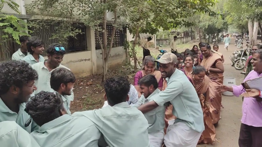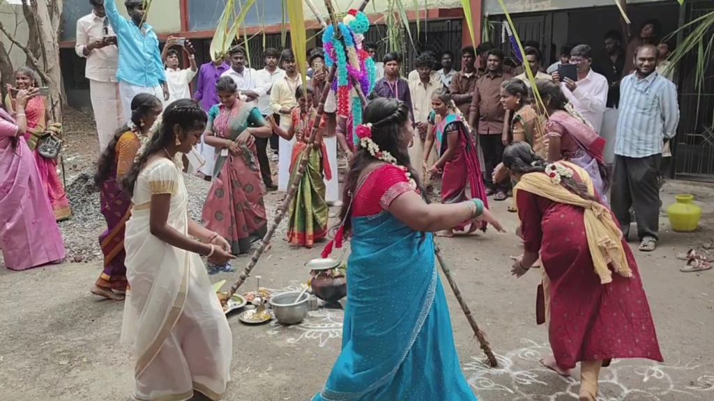அணிந்து வருகை தந்தனர். பாரம்பரிய முறைப்படி பொங்கல் வைத்து, வாழ்த்துக்கள் பொங்கிய பின் படையல் இட்டு, பொங்கல் பானையை சுற்றி குறவை மற்றும் கும்மி அடித்து கொண்டாடினர். பின்னர் மாணவ, மாணவிகளுக்கு கயிறு இழுத்தல், பாட்டிலில் தண்ணீர் நிரப்புதல், உறியடித்தல்