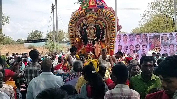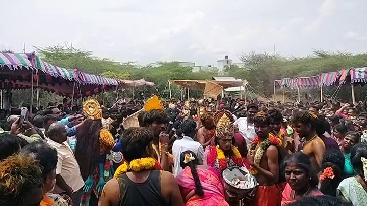 அங்கு மயானத்தில் அமைக்கப்பட்டிருந்த சுவாமி அம்பாள் உருவத்துக்கு கீழ் கொட்டப்பட்டிருந்த அரிசி சாதத்தில், கிடா வெட்டி அதன் ரத்தம் கலந்த சாதத்தை, அங்கு திரண்டிருந்தது பெண்கள் மடியேந்தி பெற்றுக்கொண்டனர். இந்த திருவிழாவில் பங்கேற்று, ரத்த கலந்த சாதத்தை சாப்பிட்டால், குழந்தை இல்லாத தம்பதியினருக்கு குழந்தை பேறு, திருமணத்தடை, பில்லி, சூனியம் உள்ளிட்டவை நீங்கும் என்ற ஐதீகத்தால் அரியலூர் நகர பகுதிகளைச் சேர்ந்த திரளான பக்தர்கள் நிகழ்ச்சியில் கலந்து கொண்டனர். இந்நிகழ்ச்சியில் சாமி ஆடிகள், பக்தர்கள் நேர்த்தி கடனாக வழங்கிய கோழிகளை பெற்று, அதன் ரத்தத்தை உறிஞ்சி குடித்தனர்.