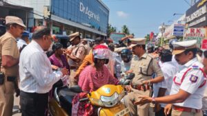 தொடர்ந்து அனு மருத்துவமனை எதிரில் போக்குவரத்து பிரிவு போலீசார் இருசக்கர வாகனத்தில் தலைக்கவசம் அணியாமல் வந்தவர்களை வரிசைப்படுத்தி நிறுத்தினர். பின்னர் அவர்களுக்கு சிறப்பு விருந்தினர் மாவட்ட