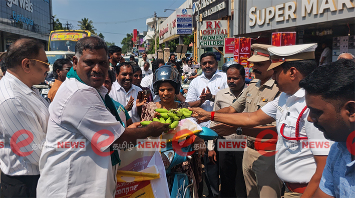 தஞ்சாவூர்: தஞ்சாவூரில் தலைக்கவசம் அணியாமல் வந்தவர்களுக்கு தலை கவசமும், அணிந்து வந்தவர்களுக்கு ஒரு தார் வாழைப்பழமும் வழங்கி நூதன முறையில் விழிப்புணர்வு ஏற்படுத்தப்பட்டது.