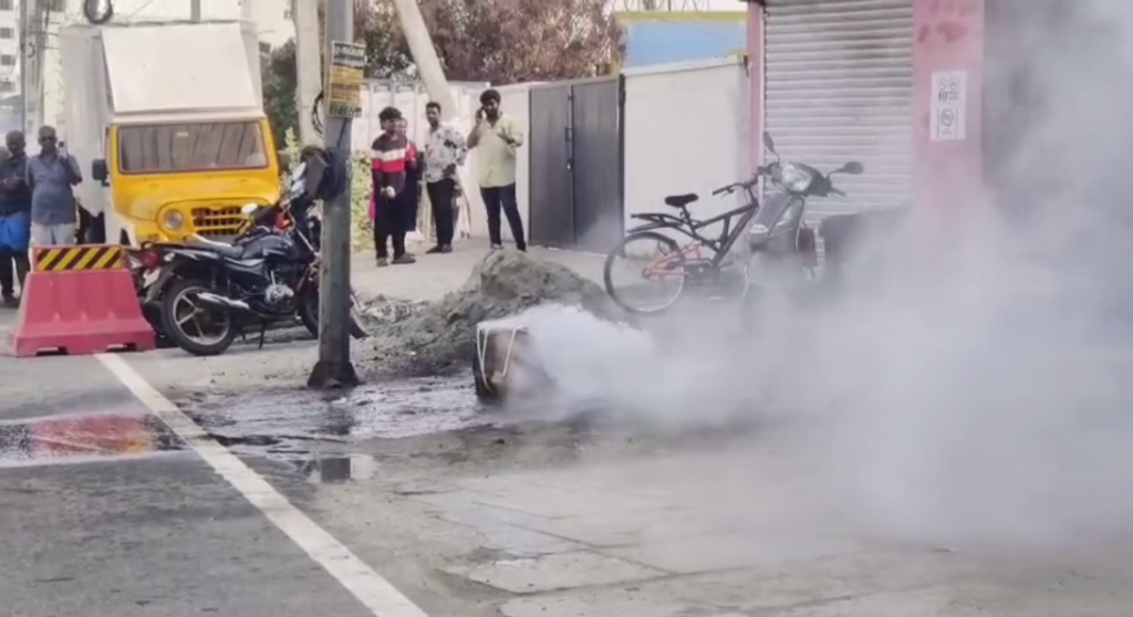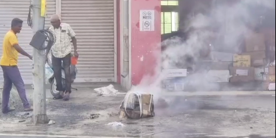 கரூரில் கொரியர் அலுவலகத்தில் பேட்டரி பார்சல் திடீரென தீப்பற்றியது, ஊழியர்கள் துரிதமாக செயல்பட்டதால் பெரும் விபத்து தவிர்க்கப்பட்டது: பகுதியில்சிறிது நேரம் பரபரப்பு நிலவியது.