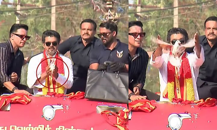 தமிழக வெற்றிக் கழகம் கட்சியின் தலைவர் விஜய், சமீபத்தில் திருச்சி கிழக்கு தொகுதியில் தேர்தல் பிரசாரத்திற்கு சென்றிருந்தார். அங்கு அவர் தனது பிரசார வாகனத்தின் மீது ஏறி நின்றவாறு ரோடு ஷோ நடத்தினார். அப்போது தொண்டர் கொடுத்த வெள்ளைப் புறா ஒன்றை விஜய் பறக்கவிட்டார். அந்த புறாவின் இறக்கைகளில் த.வெ.க. கொடியின் வண்ணம் பூசப்பட்டிருந்தது.