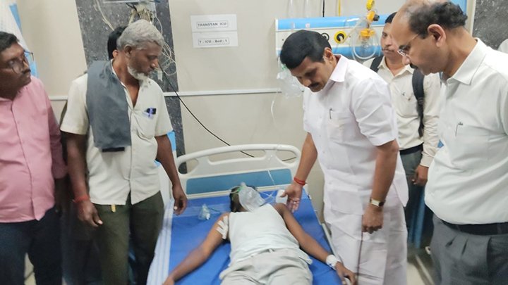 இதில் பேருந்தில் பயணம் செய்த 20-க்கும் மேற்பட்ட மாணவர்களில், பலர் உடல் மற்றும் கை, கால்களில் பலத்த காயமடைந்தனர். விபத்து நடந்தவுடன் அருகில் இருந்த பொதுமக்கள் விரைந்து வந்து காயமடைந்த மாணவர்களை மீட்டு ஆம்புலன்ஸ் மூலம் சிகிச்சைக்காக மருத்துவமனைக்கு அனுப்பி வைத்தனர். தகவலறிந்து வந்த அமைச்சர் செந்தில் பாலாஜி, மருத்துவமனையில் சிகிச்சை பெற்று வரும் மாணவர்களை நேரில் சந்தித்து ஆறுதல் கூறினார். அவர்களுக்கு அளிக்கப்படும் சிகிச்சைகள் குறித்து மருத்துவர்களிடம் கேட்டறிந்த அவர், உரிய நடவடிக்கை எடுக்கப்படும் என உறுதி அளித்தார்.