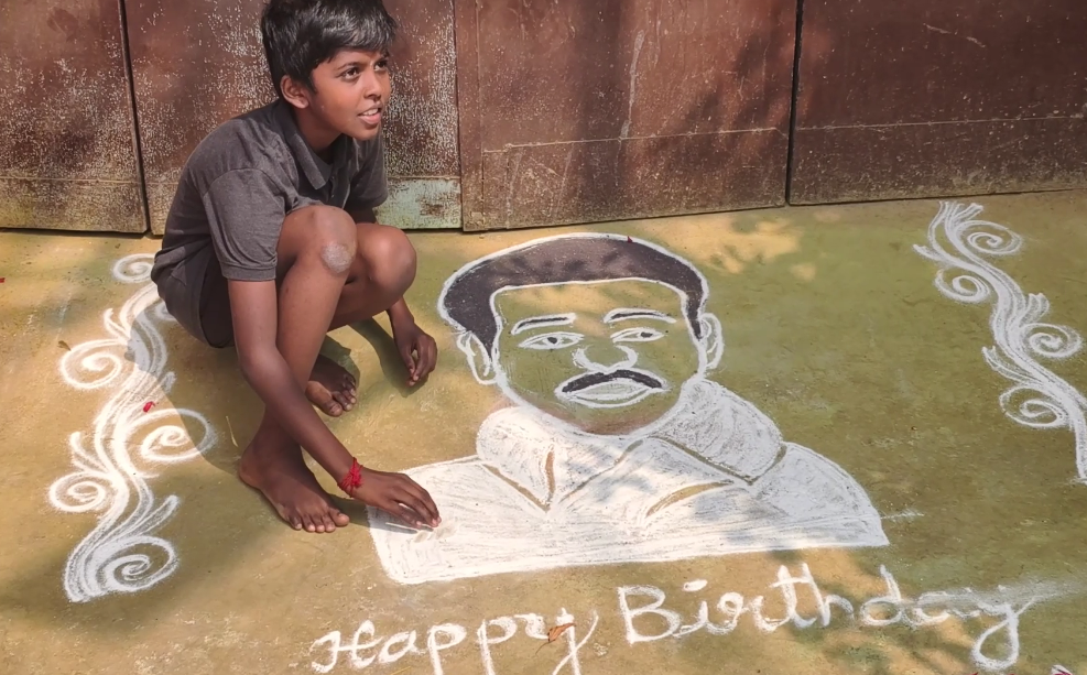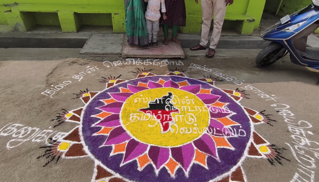 தொடந்து துடியலூர் முத்துநகர், புது முத்து நகர் பகுதியில் தமிழக முதல்வர் மு க ஸ்டாலினுக்கு பிறந்தநாள் வாழ்த்து கூறியும், ஸ்டாலினின் உருவத்தை வரைந்தும் ஒவ்வொரு வீடுகளிலும்