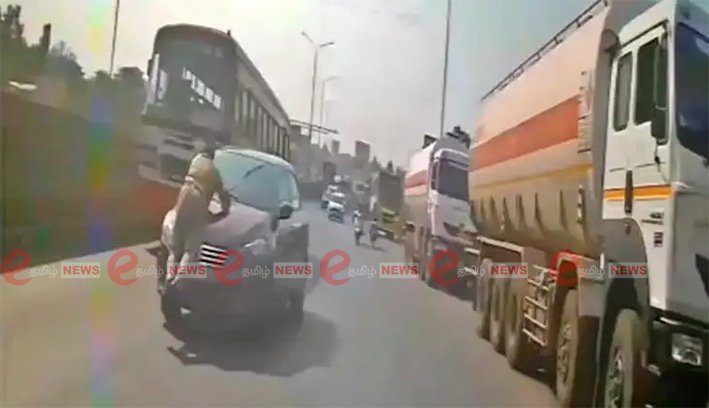 ஆனால், ஓட்டுநர் காரை நிறுத்தாமல், தலைமை காவலர் ராஜீவ் காந்தி (48) மீது இடித்து விட்டுச் சென்றுள்ளார். அதில், தடுமாறிய போலீஸ் ஏட்டு ராஜீவ் காந்தி காரின் முன் பக்க பேனட்டில் விழுந்துள்ளார். அதையும் பொருட்படுத்தாத அந்த நபர் காரை, வேகமாக இயக்கி சென்றுள்ளார். கிட்டத்தட்ட 4 கிலோ மீட்டர் தூரம் அந்த நபர் காரை ஓட்டி சென்றுள்ளார்.