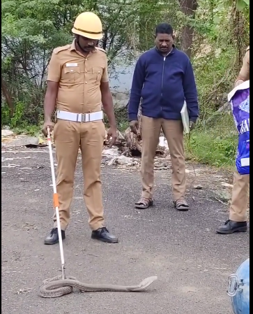 கொடுத்துள்ளார். இத்தகவலின் பெயரில் சம்பவ இடத்திற்கு விரைந்து சென்ற தீயணைப்புத்துறையினர் பிளாஸ்டிக் ட்ரம்மில் பதுங்கி இருந்த 6 ஆடி நிளமுள்ள நாகப்பாம்பை லாவகமாக தீயணைப்புத் துறையினர் பிடித்தனர். மேலும் நாகப்பாம்பை பிடித்து காப்பு காட்டு பகுதிக்கு தீயணைப்புத் துறையினர் எடுத்துச் சென்றனர்.
