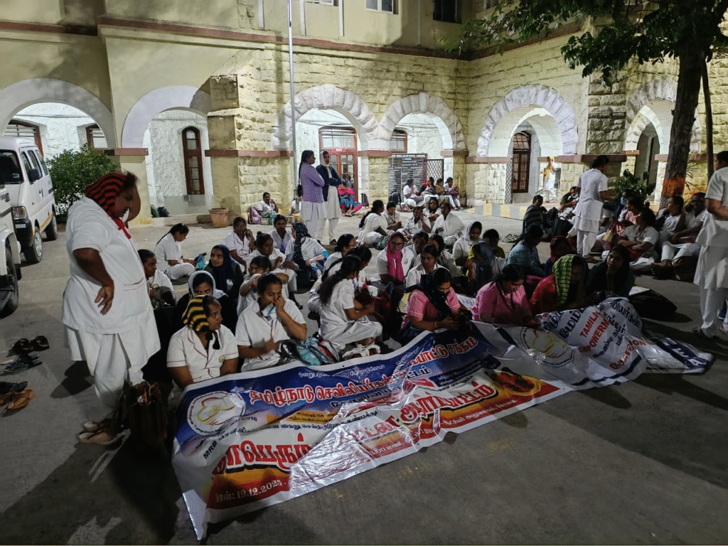 கோவை- கொட்டும் பனியில் செவிலியர்கள் உள்ளிருப்பு போராட்டம்