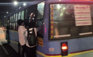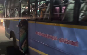 வேறு வழி இல்லாமல் அரசு பேருந்தில் பயணம் செய்வதாக பேருந்தில் பயணித்த பெண்கள் முணுமுணுத்தவாறு படிக்கட்டு தொங்கியபடி பயணம் செய்கின்றனர்.