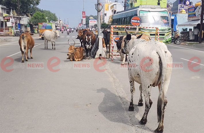 உரிமையாளர்கள் பசு மாடுகள் மற்றும் கன்று குட்டிகள் உள்ளிட்டவையை அவிழ்த்து விட்டுவதன் காரணமாக முக்கிய சாலைகளிலின் நடுவே நின்று கொண்டும் படுத்து கொண்டும் சாலையில் பயணிக்கும் வாகன ஓட்டிகளுக்கு இடையூறு ஏற்படுத்தி வருகிறது.