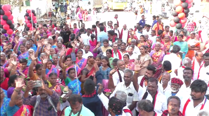 ஏராளமான பொதுமக்கள் பூக்கள் தூவி ஆரத்தி எடுத்து வரவேற்றனர்.