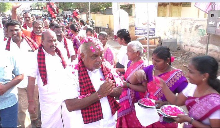 ஏராளமான பொதுமக்கள் பூக்கள் தூவி ஆரத்தி எடுத்து வரவேற்றனர்.