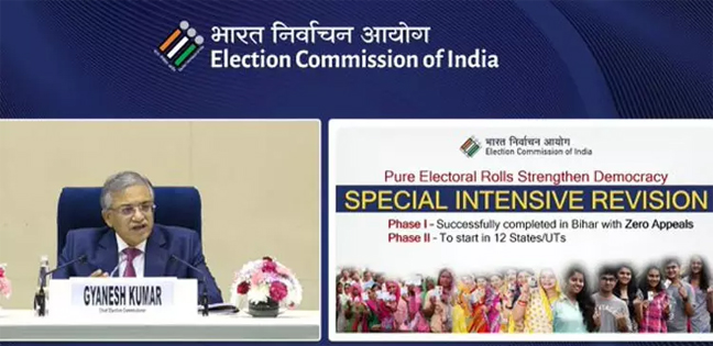 முதற்கட்டமாக பீகார் மாநிலத்தில் வெற்றிகரமாக வாக்காளர் பட்டியல் சிறப்பு தீவிர திருத்தம் நடைபெற்று முடிந்துள்ளது. பீகாரில் வாக்காளர் பட்டியல் சிறப்பு தீவிர திருத்தம் வெற்றிகரமாக முடிந்தது; எந்த மேல்முறையீடும் இல்லை. 2-ம் கட்டமாக 12 மாநில மற்றும் யூனியன் பிரதேசங்களில் வாக்காளர் பட்டியல் சிறப்பு தீவிர திருத்தம் நடக்க உள்ளது. ஒவ்வொரு தேர்தலுக்கு முன்பும் தீவிர வாக்காளர் சரிபார்ப்பு மிக மிக அவசியம். தகுதியான வாக்காளர்கள் விடுபடக் கூடாது என்பதே வாக்காளர் பட்டியல் சிறப்பு தீவிர திருத்தத்தின் நோக்கம்.