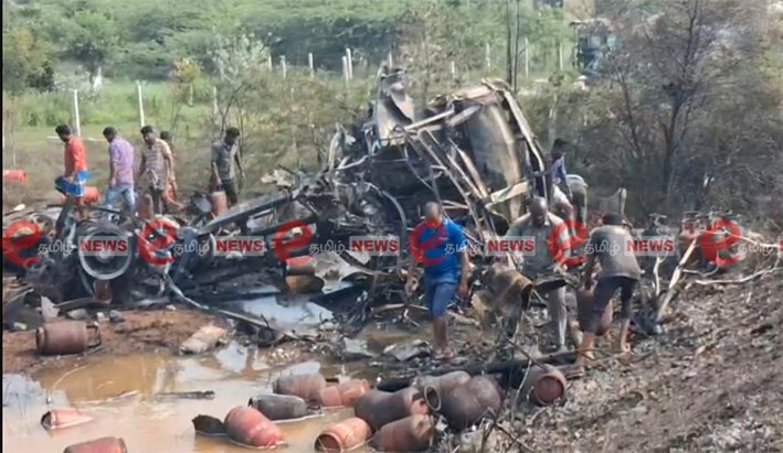அரியலூர் மாவட்டம் வாரணாசி கிராமம் பிள்ளையார் கோவில் அருகே வளைவில் திரும்பும் பொழுது, லாரி கட்டுப்பாட்டை இழந்து சாலை அருகில் உள்ள பள்ளத்தில் கவிழ்ந்து உள்ளது. இதனால் ஏற்பட்ட அழுத்தத்தில் லாரியில் இருந்த சிலிண்டர்கள் வெடித்து சிதற ஆரம்பித்துள்ளது.