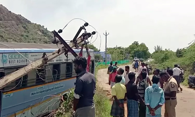 தென்காசி மாவட்டம் சங்கரன்கோவில்-வாசுதேவநல்லூர் சாலையில் அரசு பேருந்து ஒன்று சுமார் 30-க்கும் மேற்பட்ட பயணிகளுடன் சென்று கொண்டிருந்தது. அந்த பேருந்து கண்டிகைப்பேரி அருகே வந்தபோது திடீரென டிரைவரின் கட்டுப்பாட்டை இழந்து சாலையோரம் இருந்த மின்கம்பத்தில் மோதி விபத்திற்குள்ளானது.