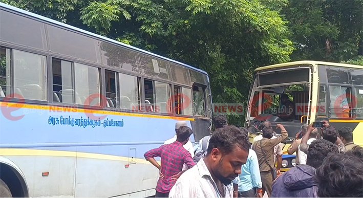 வைக்கப்பட்டனர். இது பற்றி தகவல் அறிந்து வந்து திருவிடைமருதூர் போலீசார் விபத்து நடந்த பேருந்துகளை அப்புறப்படுத்தி போக்குவரத்தை சீர் செய்து வருகின்றனர். கோவிந்தபுரம் மெயின் ரோட்டில் இதுபோன்ற விபத்துக்கள் அடிக்கடி ஏற்படுவதற்கு பிரேக் போட்டால் சாலை வலுக்கி கொண்டு செல்வதாக ஓட்டுநர்கள் தெரிவிக்கின்றனர். இதே இடத்தில் இரண்டு மாதங்கள் முன்பு அரசு பஸ் மரத்தில் போதி 20க்கும் மேற்பட்டோர் படுகாயம் அடைந்தனர்.