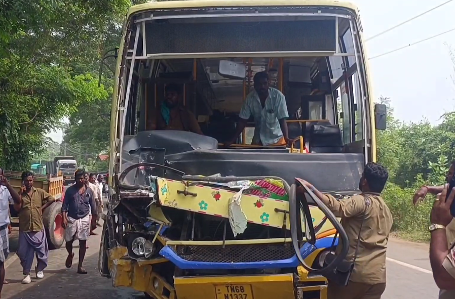 தஞ்சாவூர் மாவட்டம் திருவிடைமருதூர் அருகே கோவிந்தபுரம் மெயின் ரோட்டில் மயிலாடுதுறையில் இருந்து கும்பகோணம் நோக்கி வந்த அரசு பேருந்து டிராக்டர் டிப்பரின் சக்கரத்தில் மோதி அதே நேரத்தில் ஆடுதுறை நோக்கி வந்த அரசு நகர பேருந்திலும் மோதி கண்ணாடிகள் நொறுங்கியது. இதில் இரண்டு பேருந்துகளிலும் பயணம் செய்த 11 பயணிகள் பல்வேறு இடங்களில் காயம் பட்டு ரத்த காயங்களுடன் திருவிடைமருதூர் மற்றும் கும்பகோணம் அரசு மருத்துவமனைக்கு அனுப்பி