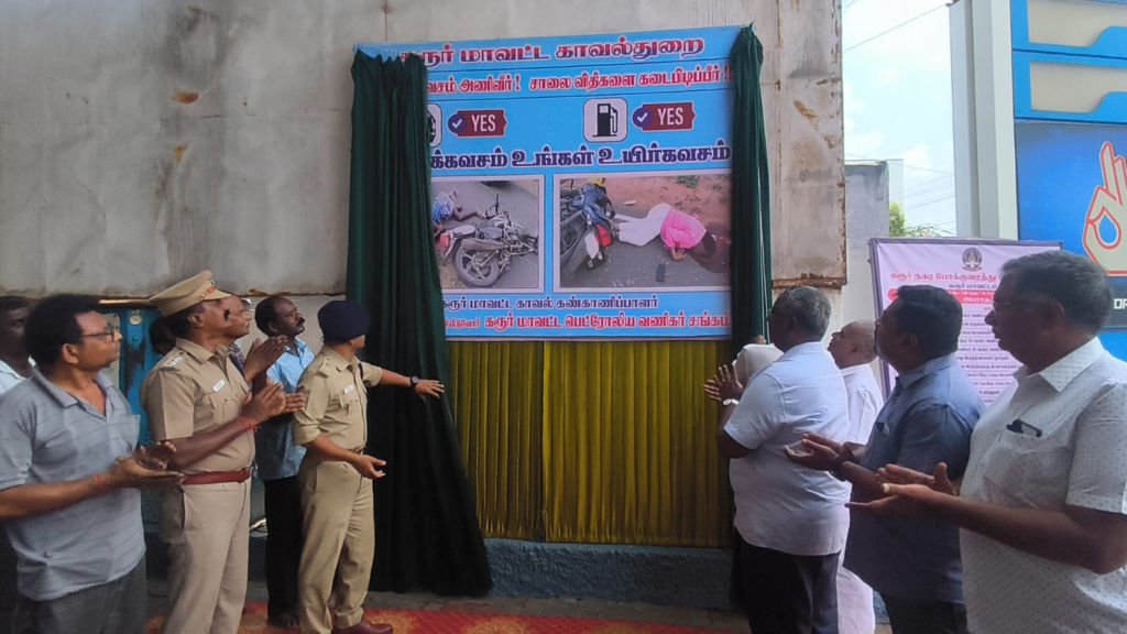 கரூர் லைட் ஹவுஸ் கார்னர் பகுதியில் உள்ள பெட்ரோல் பங்கில் நடைபெற்ற இந்த நிகழ்வில், மாவட்ட காவல் கண்காணிப்பாளர் ஹரி கிரண் பிரசாத் விழிப்புணர்வு பதாகையை திறந்து வைத்தார்.