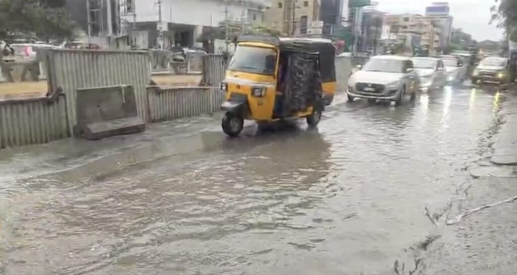 கோவை மேட்டுப்பாளையம் சாலை சாய்பாபா காலனி பகுதியில் மழை நீர் குளம் போல் தேங்கி காணப்பட்ட சூழலில் சாக்கடை கால்வாய் நிறைந்து சாக்கடை நீரும் மழை நீருடன் தேங்கியதால் கரு நிறத்துடன் சேரும் சகதியுமாக தேங்கி காணப்பட்ட மழை நீரால் கடும் துர்நாற்றத்துடன் அப்பகுதி காணப்பட்டது . இதனால் அவ்வழியே சென்ற வாகனங்கள் சாக்கடை கழிவுடன் மழை நீரில் மிதந்தபடியே சென்றதால் கோவை மேட்டுப்பாளையம் சாலையில் கடும் போக்குவரத்து நெரிசலும் ஏற்பட்டது.