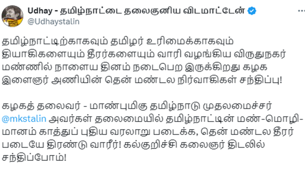 தமிழ்நாட்டிற்காகவும் தமிழர் உரிமைக்காகவும் தியாகிகளையும் தீரர்களையும் வாரி வழங்கிய விருதுநகர் மண்ணில் நாளைய தினம் நடைபெற இருக்கிறது கழக இளைஞர் அணியின் தென் மண்டல நிர்வாகிகள் சந்திப்பு!.
