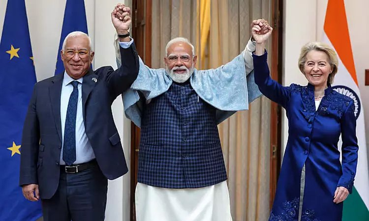 இந்தியா மற்றும் ஐரோப்பிய ஒன்றியத்திற்கு இடையே பல ஆண்டுகளாக எதிர்பார்க்கப்பட்ட சுதந்திர வர்த்தக ஒப்பந்தம் (FTA) இன்று முறைப்படி இறுதி செய்யப்பட்டது. இதற்காக இந்தியா வந்துள்ள ஐரோப்பிய கவுன்சில் தலைவர் அன்டோனியோ கோஸ்டா மற்றும் ஐரோப்பிய ஆணையாளர் ஊர்சுலா வான்டர் லெயன் ஆகியோருக்கு டெல்லி ஐதராபாத் இல்லத்தில் பிரதமர் மோடி இன்று விருந்து அளித்து கௌரவித்தார். முன்னதாக குடியரசு தின விழாவில் சிறப்பு விருந்தினர்களாகப் பங்கேற்ற அவர்களுக்கு ராணுவ அணிவகுப்பு மரியாதையும் வழங்கப்பட்டது.