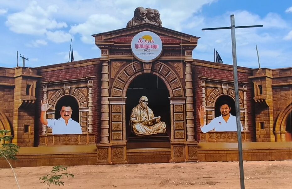 கலைஞர், அறிஞர் அண்ணா, தந்தை பெரியார், முதல்வர் மு க ஸ்டாலின், துணை முதல்வர், உதயநிதி ஸ்டாலின் உள்ளிட்டவர்கள் புகைப்படத்துடன் முப்பெரும் விழா பணிகள் மும்மரமாக நடைபெற்று வருகிறது.
