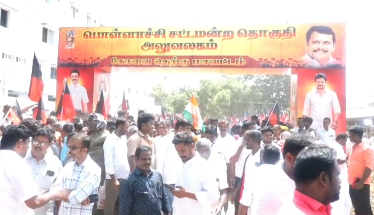 திமுக தலைமையிலான மதசார்பற்ற முற்போக்கு கூட்டணி சார்பில் பொள்ளாச்சி சட்டமன்றத் தொகுதியில் கொங்கு நாடு மக்கள் தேசிய கட்சி வேட்பாளர் கே.நித்தியானந்தத்திற்கு திமுக கட்சி அலுவலகத்தில் உற்சாக வரவேற்பளிக்கப்பட்டது. இதனைத் தொடர்ந்து ஆயிரத்துக்கும் மேற்பட்ட திமுக கூட்டணி கட்சி நிர்வாகிகளுடன் பேரணியாக சென்று அவர்