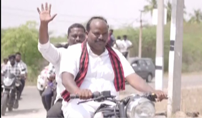 கிருஷ்ணராயபுரம் திமுக வேட்பாளர் ராஜா இருசக்கர வாகனத்தில் சென்று பொதுமக்களிடம் உதய சூரியன் சின்னத்திற்கு வாக்கு சேகரித்தார்.