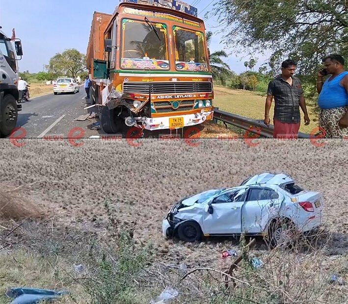 கர்நாடக மாநிலம், பெங்களூருவை சேர்ந்தவர் கணேசன் (69). இவர் தனது மனைவி ராதிகாவுடன் (66) திருச்சி மாவட்டம், ஸ்ரீரங்கத்தில் உள்ள அம்மா மண்டபத்தில் திதி கொடுப்பதற்காக காரில் புறப்பட்டு வந்துள்ளார். காரை டிரைவர் கிருஷ்ணன் என்பவர் ஓட்டி உள்ளார். திருச்சி – நாமக்கல் சாலையில் முசிறி நகர பேருந்து நிலையம் அருகே கார் வந்து கொண்டிருந்தபோது எதிர்பாராத விதமாக டிரைவரின் கட்டுப்பாட்டை இழந்த கார் திருச்சியில் இருந்து நாமக்கல் நோக்கி சென்ற லாரி மீது மோதியதில் அந்தரத்தில் பறந்து சென்று பள்ளமான பகுதியில் இருந்த வயலில் சென்று விழுந்துள்ளது. இதில் கார் அப்பளம் போல் நொறுங்கியது. இதில் படுகாயமடைந்த ராதிகாவை அருகில் இருந்தவர்கள் மீட்டு முசிறி அரசு மருத்துவமனைக்கு அனுப்பி வைத்தனர். ஆனால் அங்கு சிகிச்சை பலனின்றி ராதிகா பரிதாபமாக உயிரிழந்தார்.
