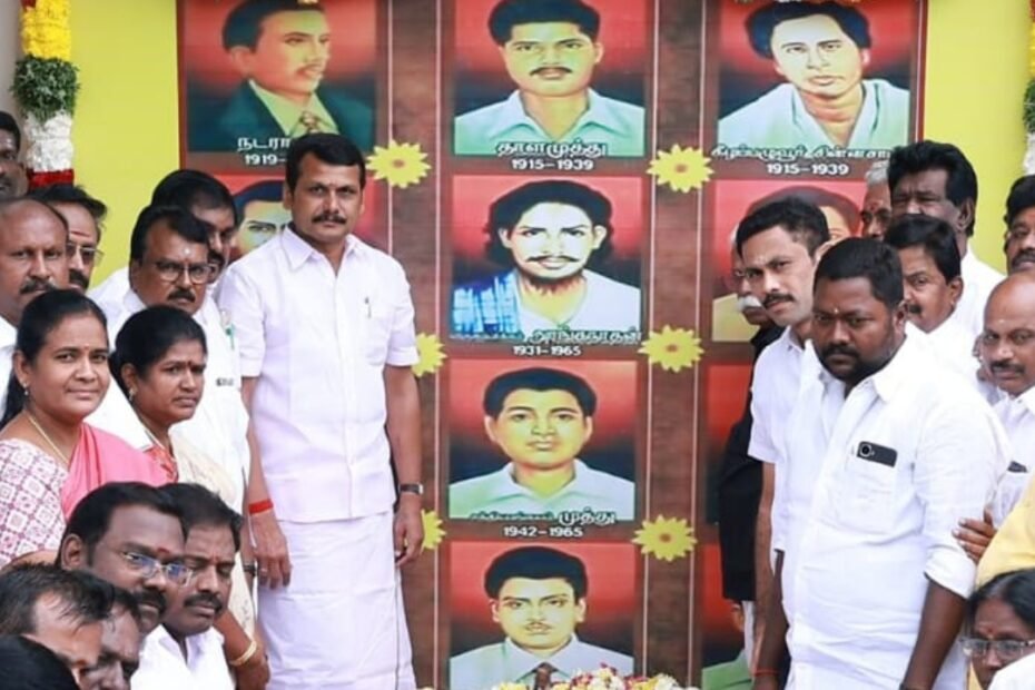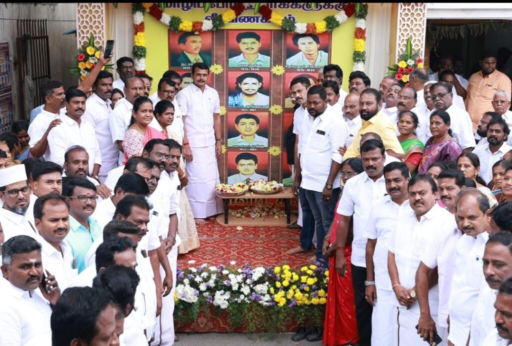 கரூர் கலைஞர் அறிவாலயத்தில், அன்னை தமிழை காத்திட தன்னை தமிழ் மண்ணுக்கு ஈந்த தியாக சுடர்களான மொழி போர் தியாகிகளின் திருவுருப் படங்களுக்கு எம் எல்ஏ செந்தில்பாஜி மலர் தூவி மாலை அணிவித்து மரியாதை செலுத்தினார்.