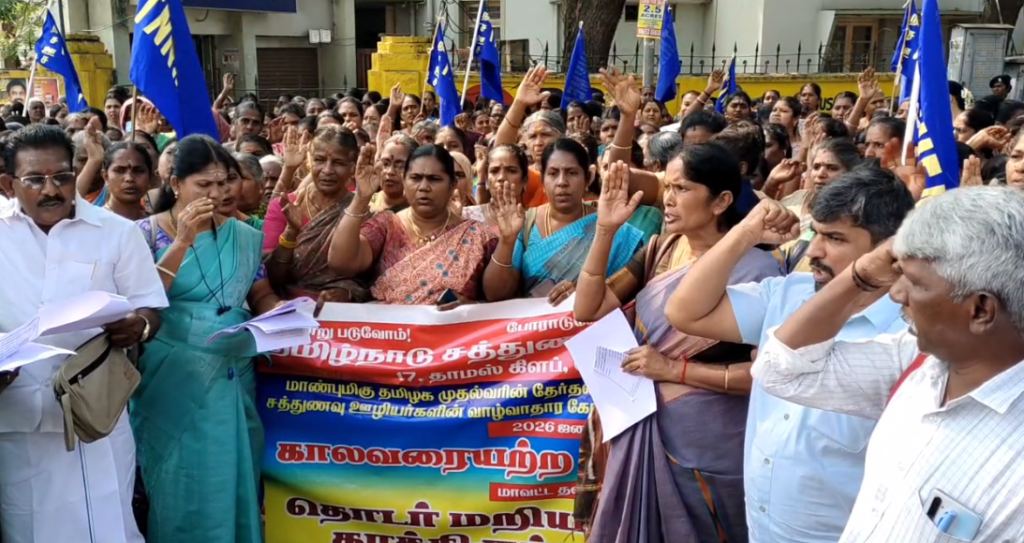 வேண்டும், ஐந்தாண்டு பணி முடிந்த சமையல் உதவியாளர்களுக்கு பதவி உயர்வு வழங்க வேண்டும், குடும்ப பாதுகாப்புடன் கூடிய ஓய்வூதியம் 9000 ரூபாய் வழங்க வேண்டும், காலை சிற்றுண்டி திட்டத்தை சத்துணவு ஊழியர்களிடமே வழங்க வேண்டும் உள்ளிட்ட கோரிக்கைகளை வலியுறுத்தி போராட்டம் அறிவிக்கப்பட்டு தமிழ்நாடு முழுவதும் நடைபெற்று வருகிறது.