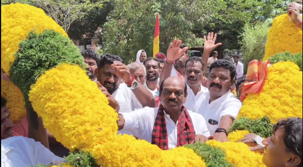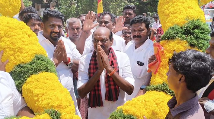 ஊதி வரவேற்று, சுமார் 11 அடி உயரத்தில் 350 கிலோ கொண்ட செண்டிப்பூ மாலையை கிரேன் மூலம் வைத்து 10க்கும் மேற்பட்டோர் மாலையை பிடித்து அவருக்கு அணிவித்தனர், மேலும் சுமார் 10
