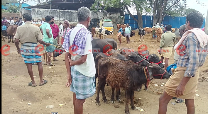வெளி மாவட்டங்கள், வெளிமாநிலங்களில் இருந்து 10 ஆயிரத்திற்க்கும் மேற்பட்ட மாடு மற்றும் எருமைகள் கொண்டு வரப்பட்டிருந்தது. அதனை வாங்குவதற்காக கேரளா உள்பட பல்வேறு பகுதிகளில் 350க்கும் மேற்பட்ட வியாபாரிகளும் வந்திருந்தனர். இதனால் காலை முதலே சந்தை களை கட்டி உள்ளது. இதனால் கேரள வியாபாரிகள் அதிகளவில் மாடு மற்றும் எருமைகளை வாங்கினர். கூட்டம் அதிகரித்து காணப்பட்டதால் மூன்று கோடிம் ஆடு கோழி வர்த்தகம் நடைபெற்றது என வியாபாரிகள் தெரிவித்தனர்.