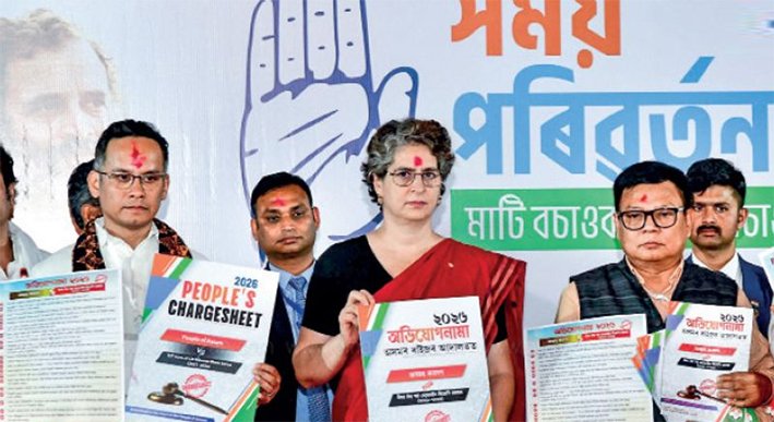 அசாமில் விரைவில் சட்டப்பேரவை தேர்தல் நடக்க உள்ள நிலையில், காங்கிரஸ் பொதுச் செயலாளர் பிரியங்கா காந்தி தலைமையிலான அக்கட்சியின் ஆய்வுக்குழு 2 நாள் பயணமாக கவுகாத்தி சென்றுள்ளது. இந்நிலையில் கவுகாத்தியில் நேற்று நடந்த நிகழ்ச்சியில், அசாம் பாஜ அரசுக்கு எதிராக 20 அம்ச குற்றப்பத்திரிகையை பிரியங்கா காந்தி வெளியிட்டார். ‘அசாம் மக்கள் vs ஹிமந்தா பிஸ்வா சர்மாவின் பாஜ அரசு (2021-2026)’ என 12 பக்க குற்றப்பத்திரிகைக்கு தலைப்பிடப்பட்டுள்ளது. இந்த குற்றப்பத்திரிகையில், முதல்வர் ஹிமந்தா பிஸ்வா சர்மா, அவரது நெருங்கிய அமைச்சர்கள் மற்றும் அவர்களது குடும்பத்தினர் ஊழலில் திளைப்பதாகவும், சட்டவிரோத சொத்து குவிப்பில் ஈடுபட்டுள்ளதாகவும் குற்றம்சாட்டப்பட்டுள்ளது.