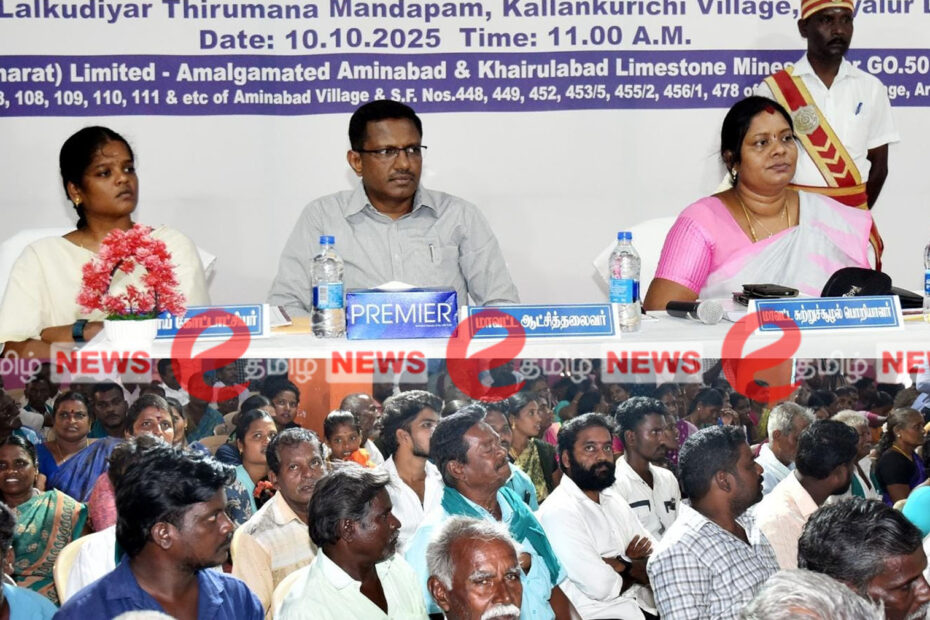அரியலூர் மாவட்டம், டால்மியா சிமெண்ட் (பாரத்) லிமிடெட் ஒருங்கிணைக்கப்பட்ட அமினாபாத் & கயர்லாபாத் சுண்ணாம்புக்கல் சுரங்கம் விஸ்தீரணத்திற்கான பொதுமக்கள் கருத்துக்கேட்புக் கூட்டம் மாவட்ட ஆட்சித்தலைவர் பொ.இரத்தினசாமி தலைமையில் நடைபெற்றது. டால்மியா சிமெண்ட் (பாரத்) லிமிடெட் அரசாணை 50-ன் கீழ் ஒருங்கிணைக்கப்பட்ட அமினாபாத் & கயர்லாபாத் சுண்ணாம்புக்கல் சுரங்கம் விஸ்தீரணம் 96.190 ஹெக்டேர், புல எண். 103/2, 103/3, 104/3, 105/8, 108, 109, 110, 111 மற்றும் பிற – அமினாபாத் கிராமம் மற்றும் புல எண்கள் 448, 449, 452, 453/5, 455/2, 456/1, 478 கயர்லாபாத் கிராமம், அரியலூர் வட்டம் & மாவட்டம் தொடர்பாக பொதுமக்கள் கருத்துக்கேட்புக் கூட்டம் அரியலூர் மாவட்ட நிர்வாகம் மற்றும் தமிழ்நாடு மாசு கட்டுப்பாட்டு வாரியம் சார்பில் கல்லங்குறிச்சி கிராமம், லால்குடியார் திருமண மண்டபத்தில் மாவட்ட ஆட்சித்தலைவர் பொ.இரத்தினசாமி தலைமையில் இன்று (10.10.2025) நடைபெற்றது.