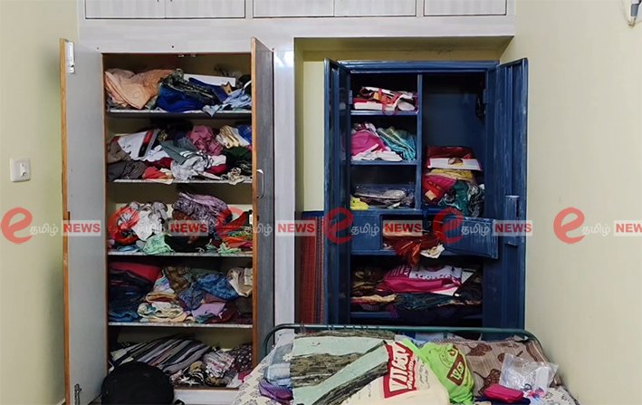 பின்னர் வீட்டிற்கு வந்து பார்த்தபோது வீட்டின் மேல் மாடியில் முன் கதவு இரும்புராடல் உடைக்கப்பட்டு இருப்பதைக் கண்டு அதிர்ச்சி அடைந்தார் பின்னர் உள்ளே சென்று பார்த்தபோது வீட்டில் உள்ள அறையில் இருந்த மூன்று பீரோக்கள் உடைக்கப்பட்டிருப்பதை அறிந்தார்.