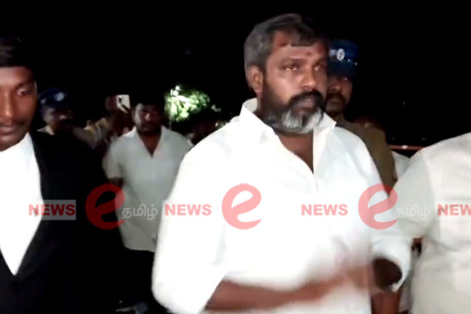 அந்த வீடியோக்களில் இருந்ததாக கிழக்கு மாவட்ட செயலாளர் வெங்கடேசனை கரூர் நகர காவல்துறையினர் இன்று பிற்பகல் சேலத்தில் வைத்து கைது செய்தனர் கைது செய்யப்பட்ட வெங்கடேசனை தற்போது கரூர் நகர காவல் நிலையத்திற்கு அழைத்து வந்துள்ளனர். வெங்கடேசன் மீது கொலை மிரட்டல், பொது சொத்துக்களை சேதப்படுத்துதல், ஆபாச வார்த்தைகளால் திட்டுதல் உள்ளிட்ட 5 பிரிவுகளின் கீழ் வழக்கு பதிவு செய்துள்ளனர்.