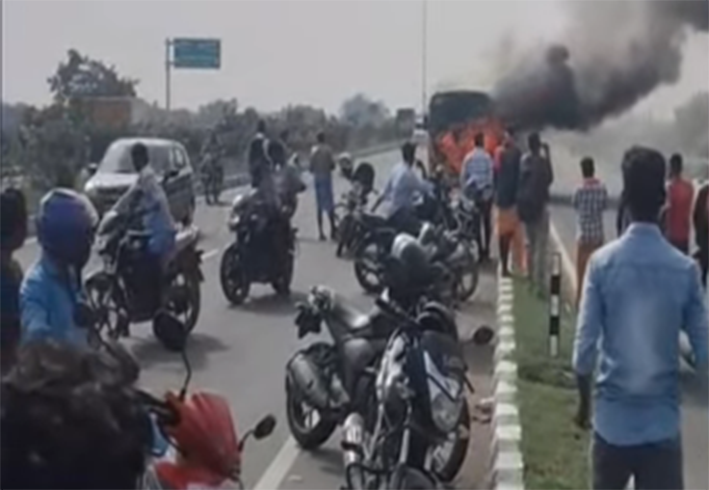 மக்கள் பாராட்டினர். மேலும் இச்சம்பவம் குறித்து போலீசார் விசாரணை மேற்கொண்டு வருகின்றனர். இதனால் அப்பகுதியில் வாகன ஓட்டிகள் அதிர்ச்சியாகினர். மேலும் பஸ் முழுவதும் எரிந்து அப்பகுதி முழுவதும் புகைமூட்டமாக மாறியது. இச்சம்பவம் அப்பகுதியில் பெரும் பரபரப்பை ஏற்படுத்தியுள்ளது.