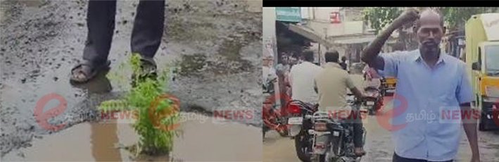 திருச்சி மாவட்டம், மணப்பாறை வேப்பிலை மாரியம்மன் கோவில் அருகே குடிநீர் குழாய் உடைப்பால் சாலையில் பள்ளம் ஏற்பட்டது. இதனால் வாகன ஓட்டிகள் கடும் சிரமத்திற்கு உள்ளான நிலையில் சுகாதாரமற்ற குடிநீரை பருகும் அவல நிலைக்கு பொதுமக்கள் தள்ளப்பட்டுள்ளனர். இந்நிலையில் குழாய் உடைப்பை சீர் செய்யும் விதமாக அதிகாரிகளின் கவனத்தை நூதன முறையில் ஈர்க்கும் பொருட்டு சமூக ஆர்வலர் இன்று சாலையில் கருவேப்பிலையை நடவு செய்தார்.